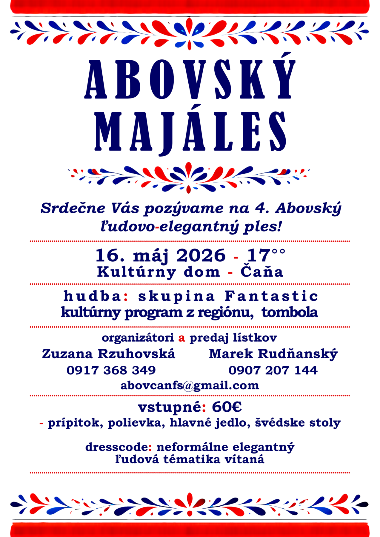 Čaká vás výnimočný večer v štýle ľudovo-elegantného majálesu, kde sa tradícia spája s noblesou, dobrou hudbou a skvelou atmosférou. Do tanca vám zahrá hudobná skupina Fantastic, pripravený je aj bohatý kultúrny program z regiónu Abov a štedrá tombola.