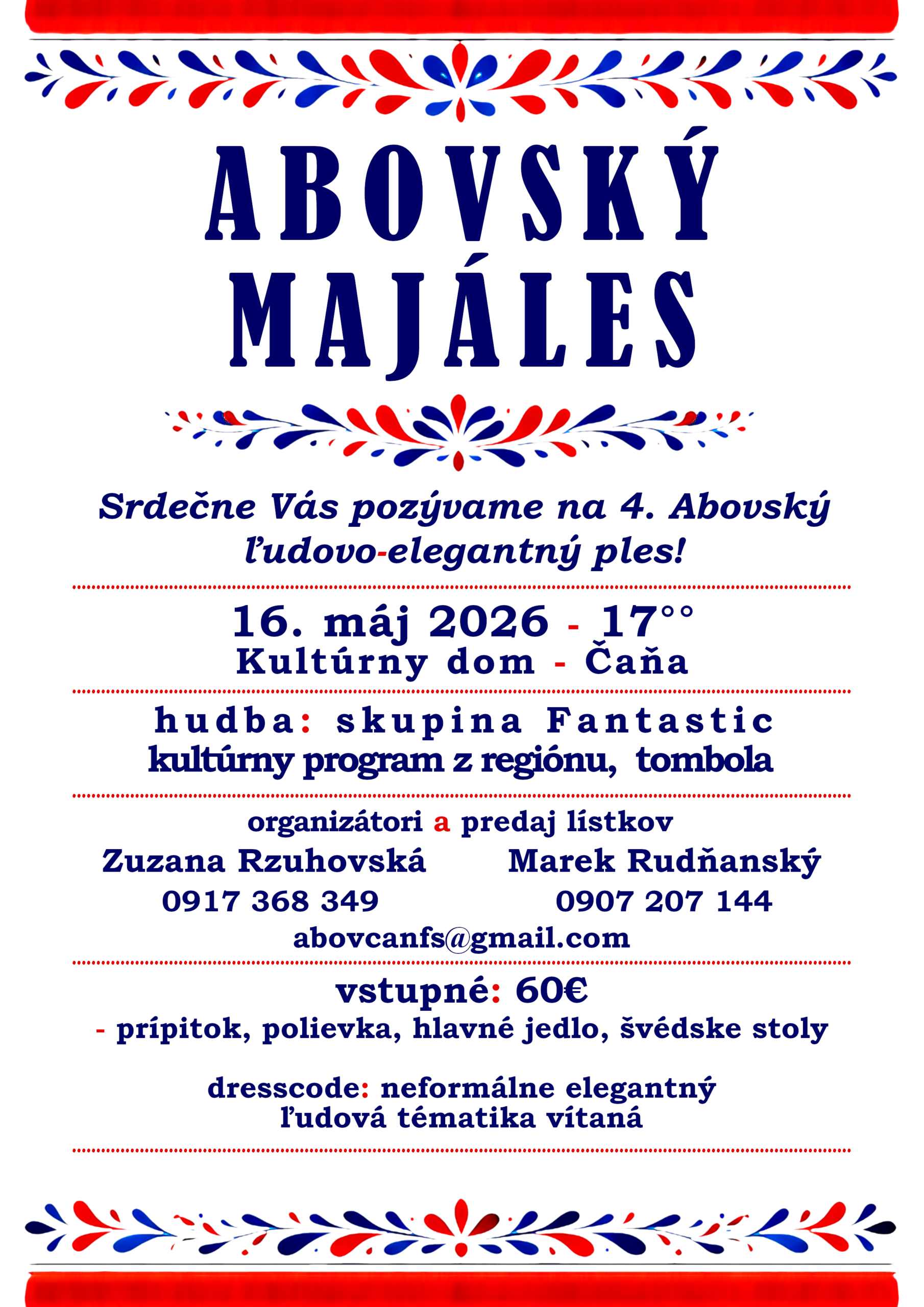 Srdečne vás pozývame na 4. ročník Abovského folklórneho plesu, ktorý sa uskutoční 16. mája 2026 o 17:00 hod. v Kultúrnom dome Čaňa.